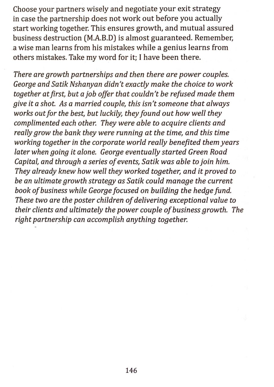 Chapter 5: How to Become the Goliath of Growth: (p.146) “There are growth partnerships and then there are power couples. . . . These two are poster children of delivering exceptional value to their clients and ultimately the power couple of business growth. The right partnership can accomplish anything together.”